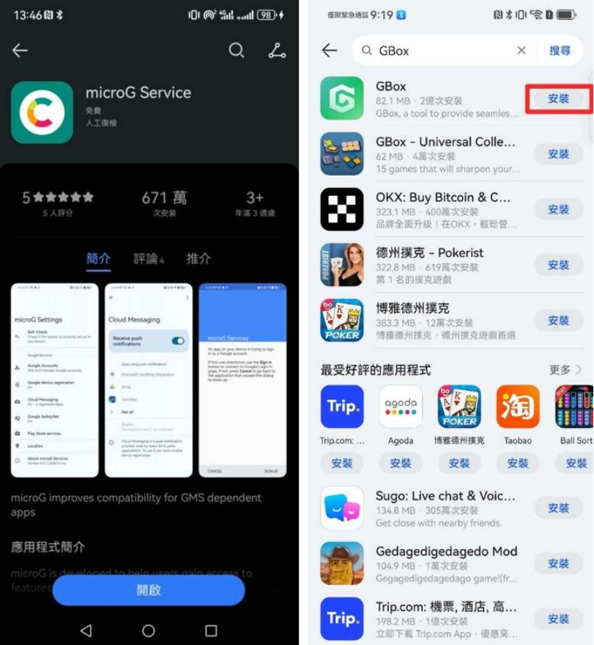 步驟 1 – 在AppGallery中搜尋並下載MicroG和GBox